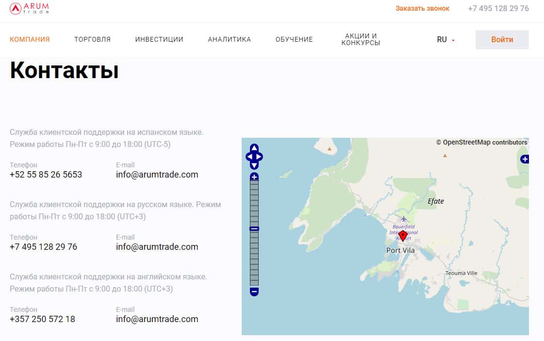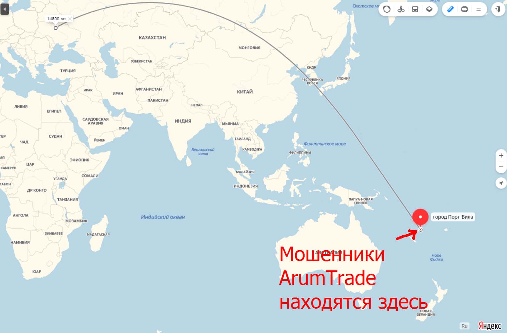 Дополнительным преимуществом для лохотрона Арум Трейд является факт их оффшорной регистрации, а именно: Pot 805103 Rue D’Auvergne, Port Vila, Vanuatu, что дает шулерам ArumTrade анонимность их счетов и владельцев. К тому же все суды кинутых пользователей с жульем Арум Трейд будут происходить непосредственно на территории оффшора.