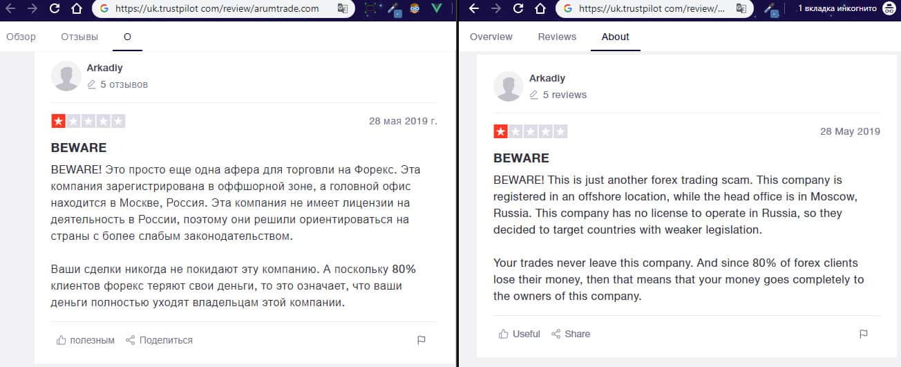 - Негативный отзыв о лохотроне ArumTrade с веб-портала trustpilot com