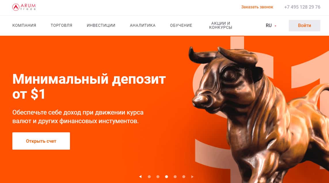 Начинается сайт у аферистов ArumTrade с довольно стандартной и банальной шапки сайта, в которой у лохотрона Арум Трейд имеется вполне стандартный позыв к наивной клиентуре открыть у мошенников ArumTrade для дальнейшего сотрудничества с данной сомнительной конторой. На изображении ниже вы можете наглядно увидеть начало подвального сайта жулья.