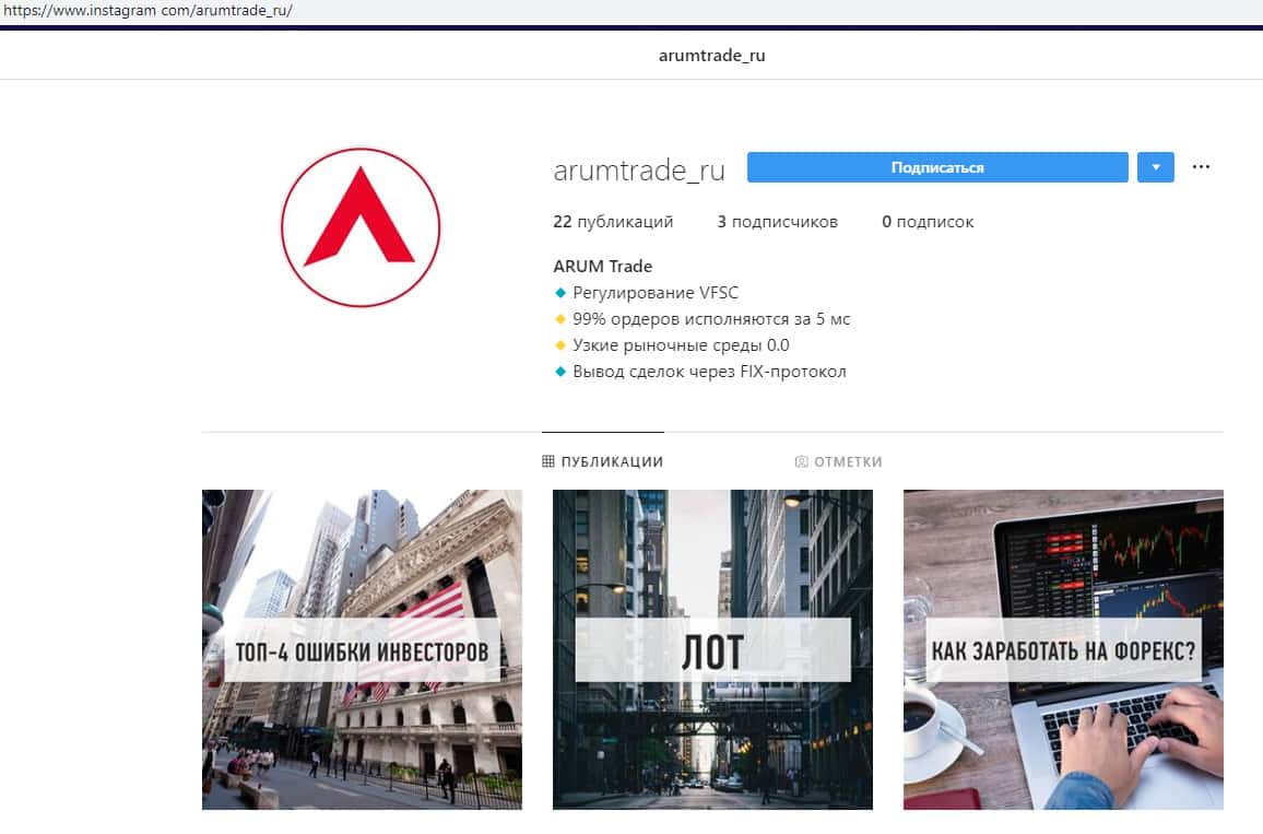 Имеется у мошенников Арум Трейд и страница в социальной сети Instagram, где у шулеров ArumTrade снова крайне мало подписчиков, что говорить о халтуре шулеров Арум Трейд, которые создали данную страницу исключительно для виду. На изображении, расположенном ниже, вы можете наглядно увидеть страницу проходимцев ArumTrade в социальной сети Инстаграм.
