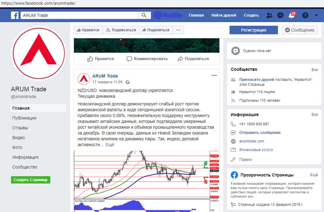 Дабы соответствовать современным трендам шулера Арум Трейд обзавелись страницами в социальных сетях одной из которых является непосредственно Facebook, где у мошенников ArumTrade имеется около сотни подписчиков. На изображении, расположенном ниже, вы можете наглядно увидеть внешний вид страницы проходимцев Арум Трейд в социальной сети Фейсбук.