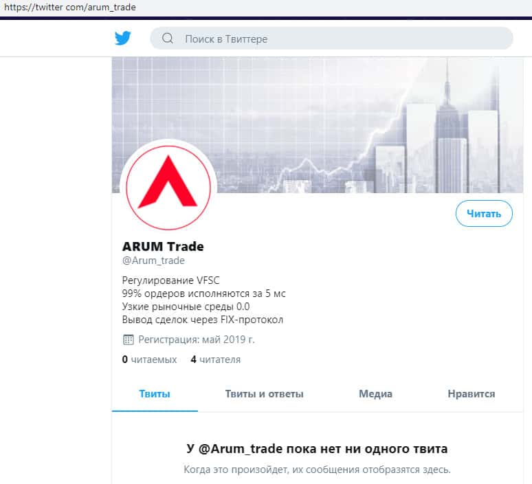Имеется у аферистов Арум Трейд и страница в социальной сети Твиттер, где у шулеров ArumTrade нету никаких постов, а подписчиков всего несколько человек, что говорит о том, что данная страница была создана исключительно для галочки. На изображении, расположенном ниже, вы можете наглядно увидеть страницу аферистов Арум Трейд в социальной сети Твиттер.