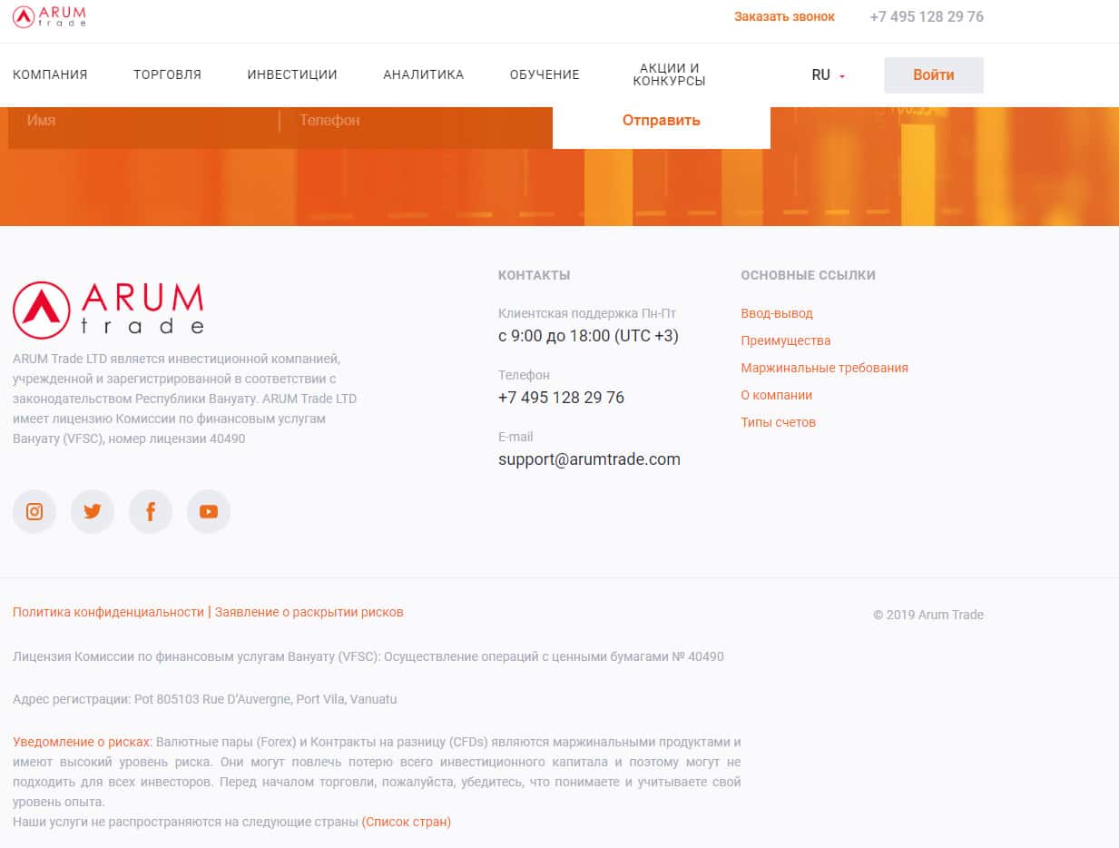 - Условий сотрудничества лохотрон ArumTrade не предоставляет