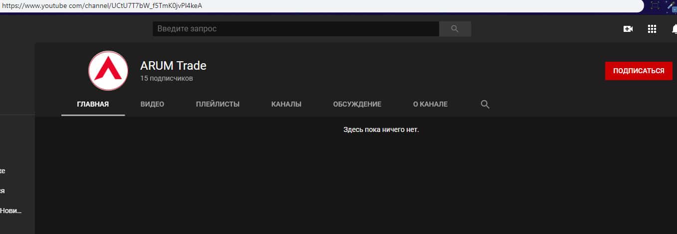 Для размещения различных мотивационных видеороликов с лапшой на уши наивной клиентуре аферисты Арум Трейд обзавелись страницей в социальной сети YouTube, где у мошенников ArumTrade имеется десяток подписчиков. На изображении, расположенном ниже, вы можете наглядно увидеть страницу аферистов Арум Трейд с Ютубе.
