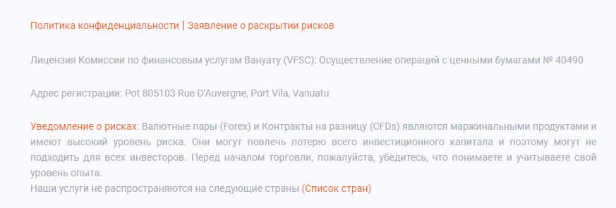 - адрес регистрации - Pot 805103 Rue D’Auvergne, Port Vila, Vanuatu;