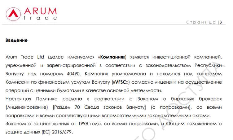 Политика конфиденциальности у мошенников ArumTrade начинается с довольно стандартной информации о том, что это за документ и зачем он нужен, которая толком не несет в себе никакой информационной нагрузки и добавлена исключительно для виду. На изображении, расположенном ниже, вы можете увидеть начало политики жулья Арум Трейд.