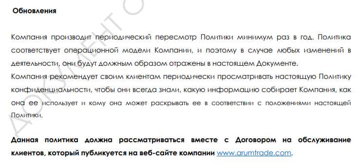 Завершается же политика конфиденциальности у аферистов Арум Трейд довольно типично и ожидаемо, а именно условием о том, что лохотрон ArumTrade может в любой момент по своему усмотрению изменить данные условия политики конфиденциальности. На изображении, расположенном ниже, вы можете наглядно увидеть окончание политики шулеров Арум Трейд.
