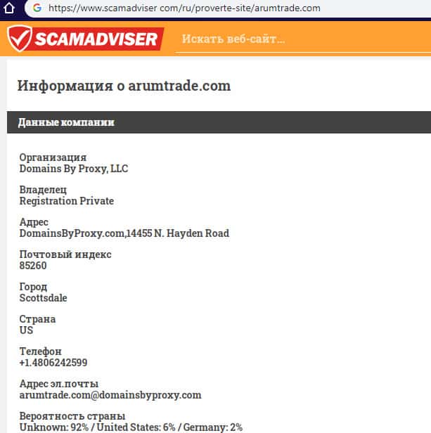 В связи с мошеннической и противозаконной деятельностью лохотрона ArumTrade его реальные руководители предпочитают анонимность дабы избежать ответственности со стороны правоохранительных органов. Техническую же информацию о сайте жулья Арум Трейд можно узнать с помощью портала scamadviser com, что вы можете наглядно увидеть ниже.