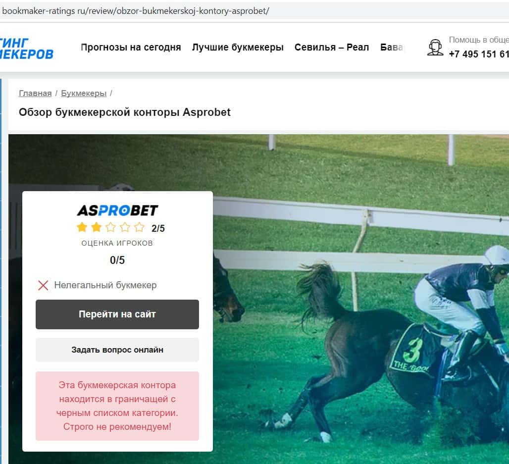 Сайт bookmaker-ratings ru пишет про БК АС Про Бет, что он не рекомендует вкладывать средства в эту контору, так как она находится в списке сомнительных, букмекер нелегальный.
