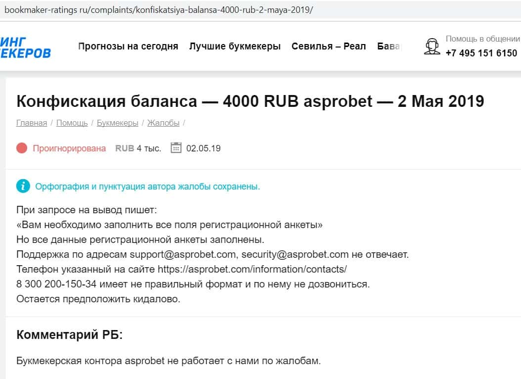 Игрок подал жалобу на БК АС Про Бет, где говорит, что администрация сайта конфисковала его средства в размере 4000 рублей. При попытке вывода приходит сообщение о регистрации.