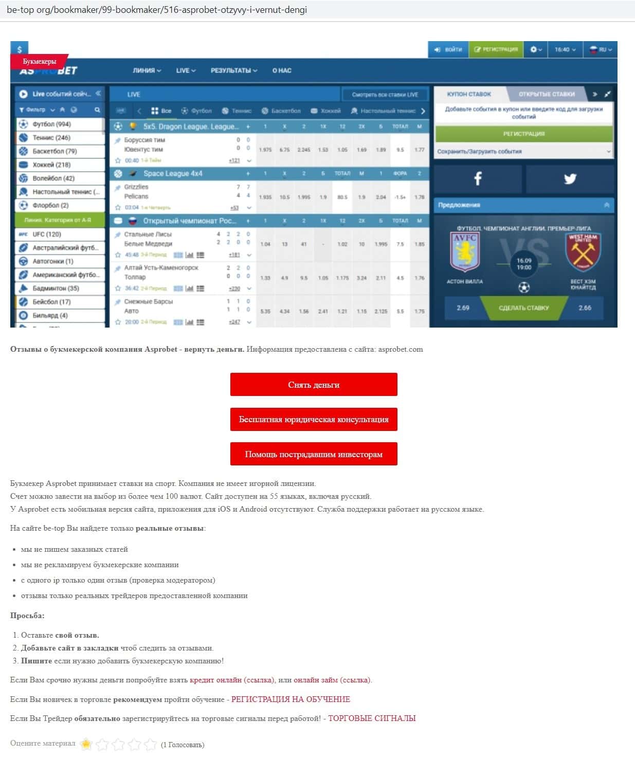 - Обзорные статьи на букмекера ASProBet, разоблачающие его