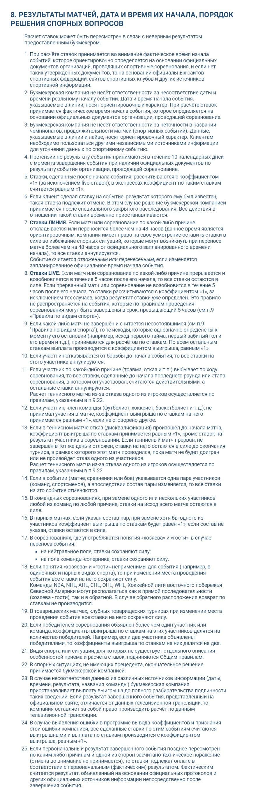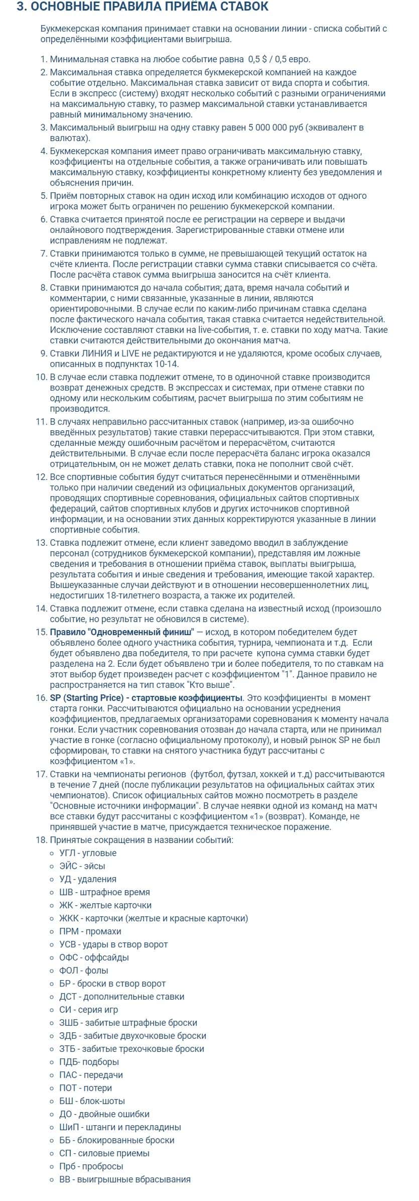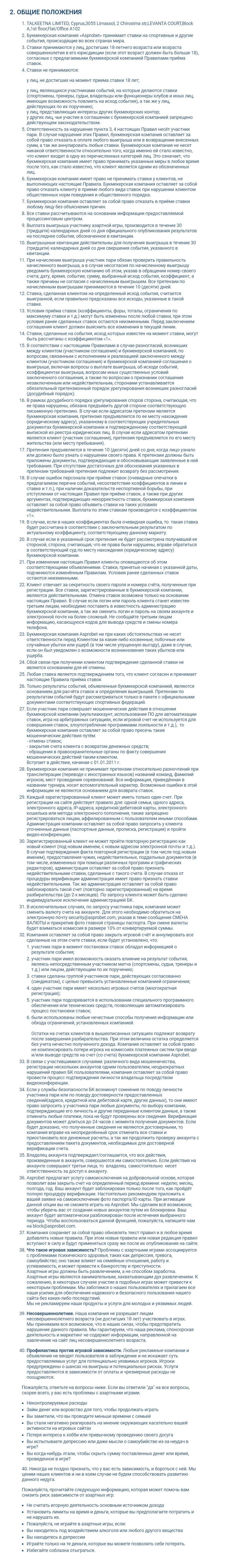 В общих положениях пишется об ответственности пользователей перед букмекером, а также основные правила получения выигрышей и условия приема ставок.