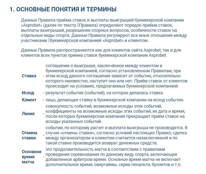 В первом разделе своего договора букмекер АС Про Бет публикует понятия и термины, которые будут фигурировать в тексте.