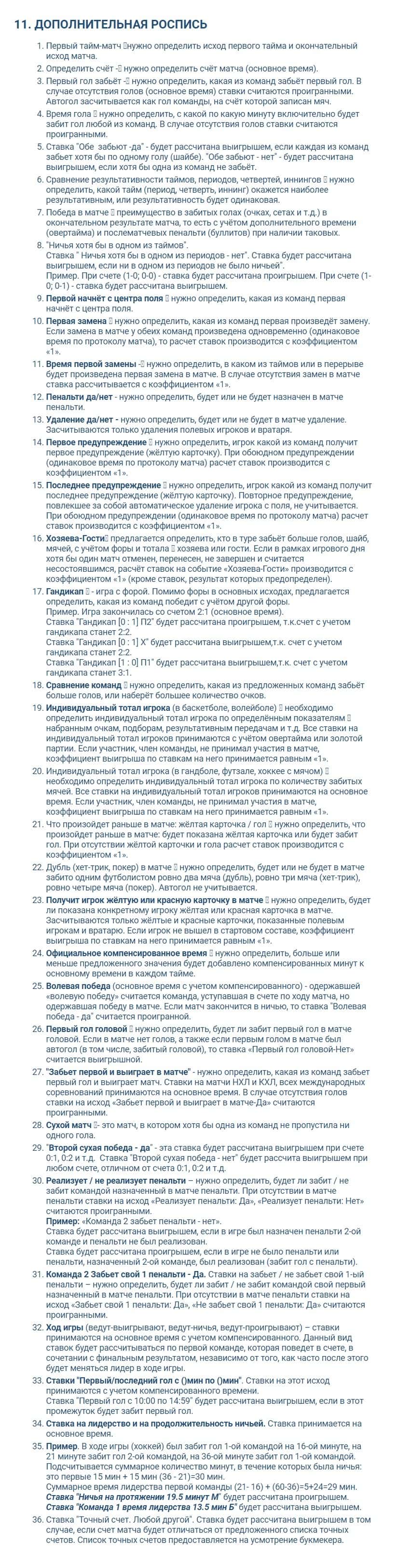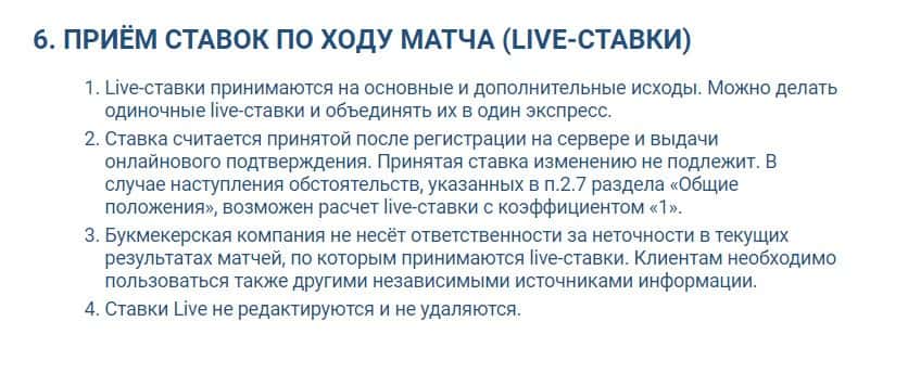 Раздел 6 рассказывает о правилах приема ставок на лайв-матчи, которые проходят в прямой трансляции.