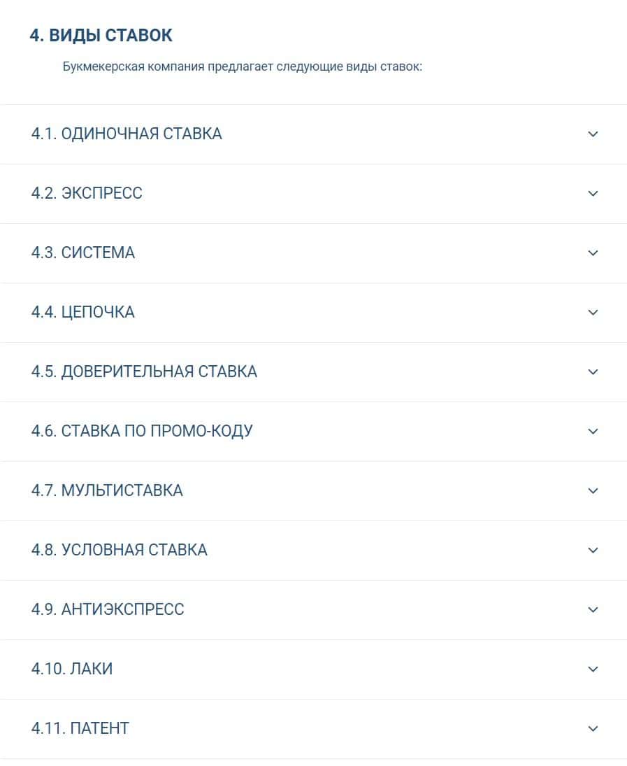 Раздел 4 рассказывает о видах ставок, которые применяются на сайте букмекера АС Про Бет.
