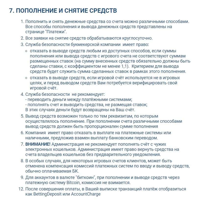 Седьмой раздел договора компании АС Про Бет описывает процедуры пополнения и снятия средств клиента с сайта букмекера.