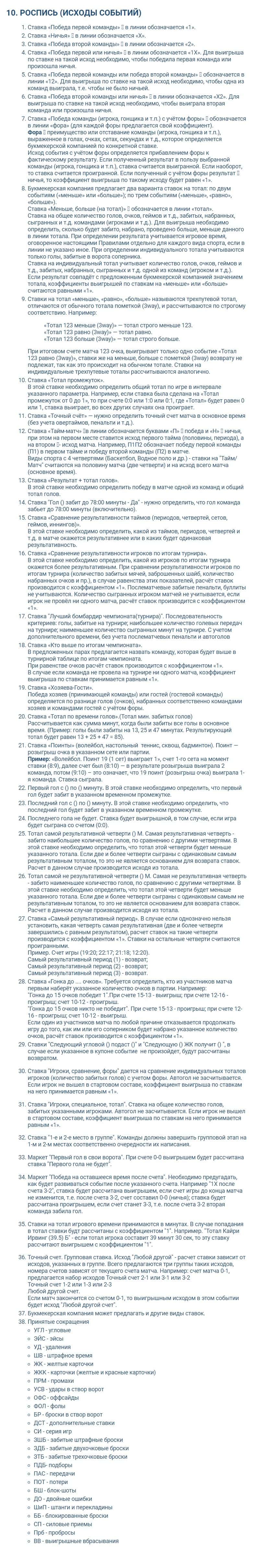 Раздел 10 называется Роспись и там описывается обозначение исходов спортивных событий на сайте букмекера АС Про Бет.