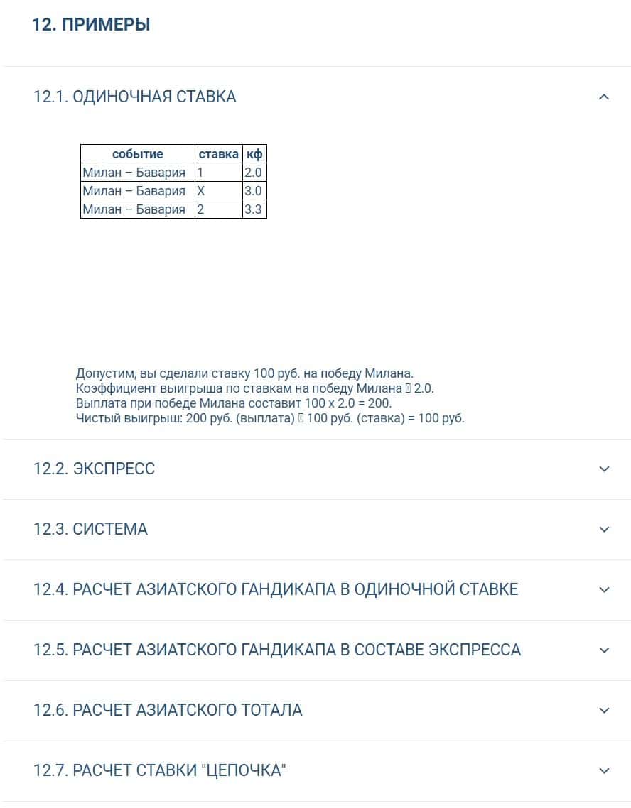 Двенадцатый раздел показывает примеры расчета ставок на события на сайте БК АС Про Бет.