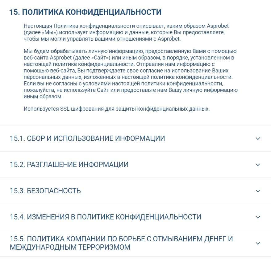 Раздел 15 описывает политику конфиденциальности, которая применяется на сайте букмекера АС Про Бет.