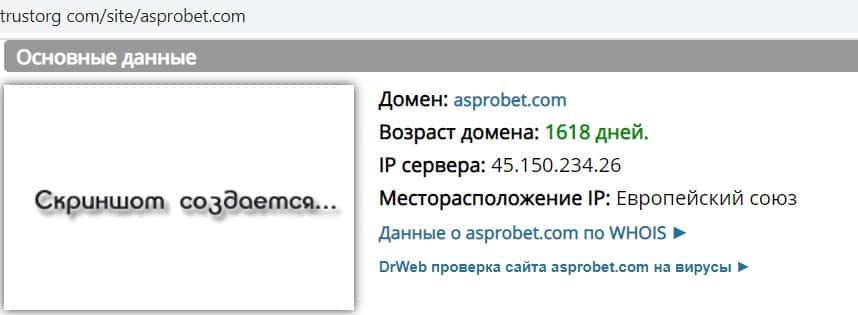 Возраст доменного имени сайта asprobet com составляет 1618 дней. Судя по информации с сайта Трасторг, данный букмекер создан несколько лет назад.