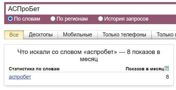 Название бренда на русском языке без пробела "АСПроБет", пользователи искали в системе Яндекс 8 раз.