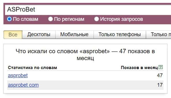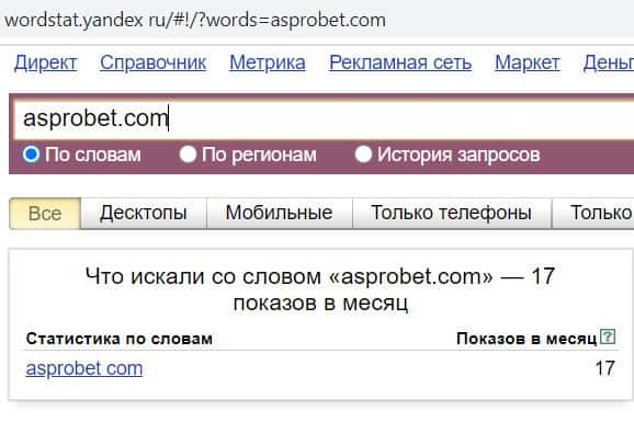 В поисковой системе Яндекс сайт букмекерской конторы "asprobet.com", вбитый в строку с точкой, пользователи искали 17 раз за месяц.
