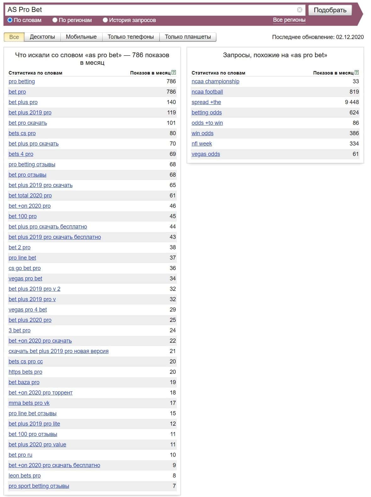 То же название "AS Pro Bet", но написанное с пробелом, люди пытались найти в системе Яндекс 786 раз.