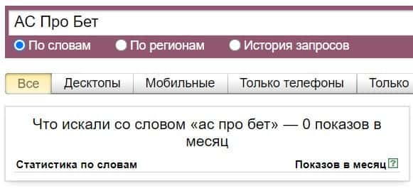 Посмотрим, сколько раз люди искали название бренда "АС Про Бет" на русском языке с пробелом: 0 раз за месяц.