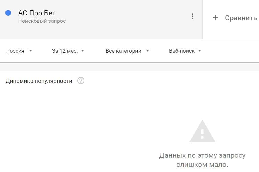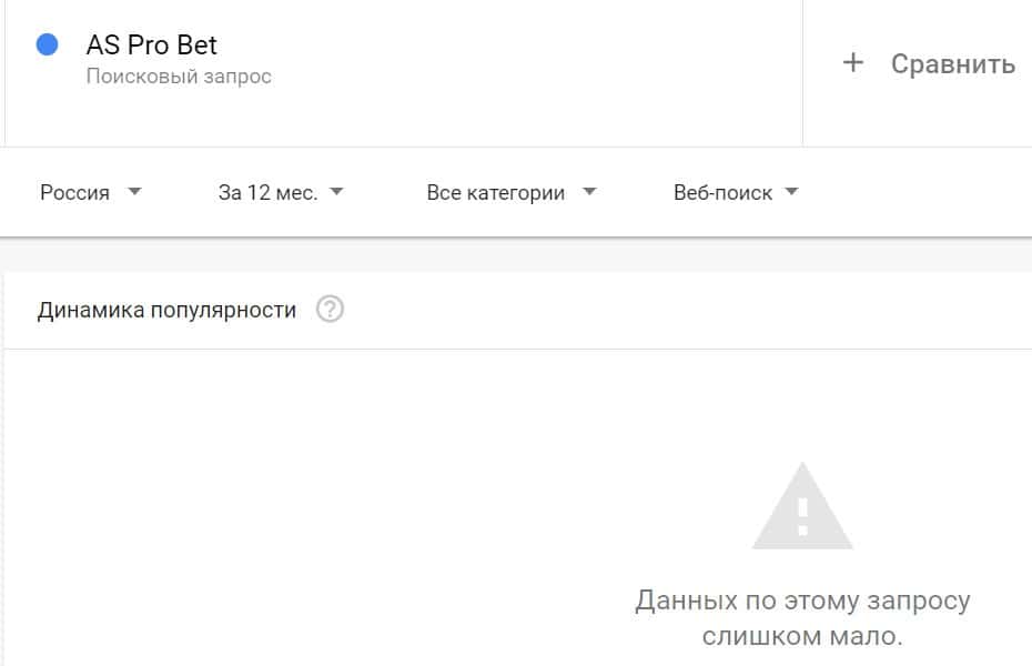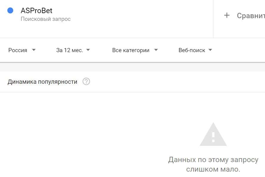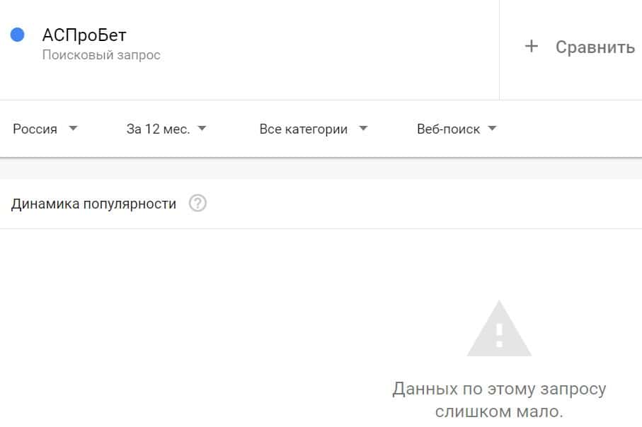 Посмотрим, насколько популярно название бренда "ASProBet", написанное на английском языке. Данных по этому запросу нет, так как никто не искал этот бренд в Гугл.