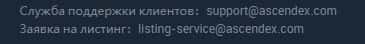 Далее представлены контактные данные мошеннической крипто-биржи Асценд ЕХ. Контора указала на сайте только две электронные почты, так как боится прямых контактов. Вот данные: