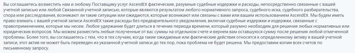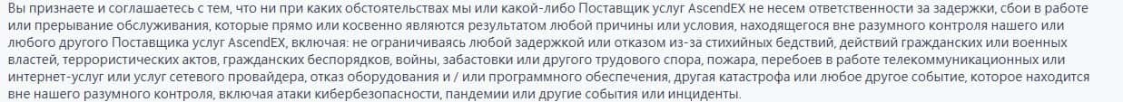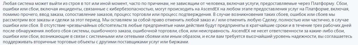 Также контора AscendEX в договоре указывает, что они не исключают варианты, когда система может выйти из строя и принести убытки клиентам. Компенсировать они не будут.