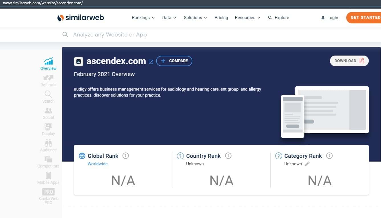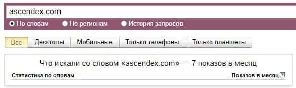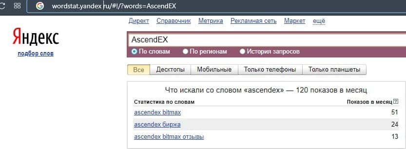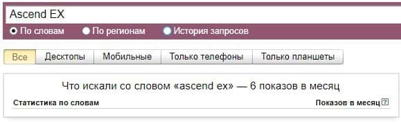 Что касается запроса самого сайта конторы "ascendex.com" так здесь такая же ситуация. Всего 7 запрос в месяц выдала поисковая система Яндекс.