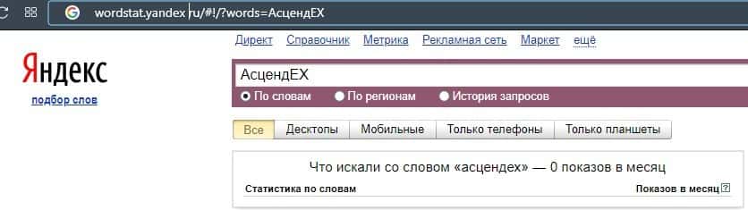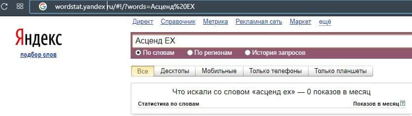 По поводу другого запроса конторы "АсцендЕХ" мошенники в Яндексе не выставили ни одного показа за последний месяц, что является ничтожным показателем.