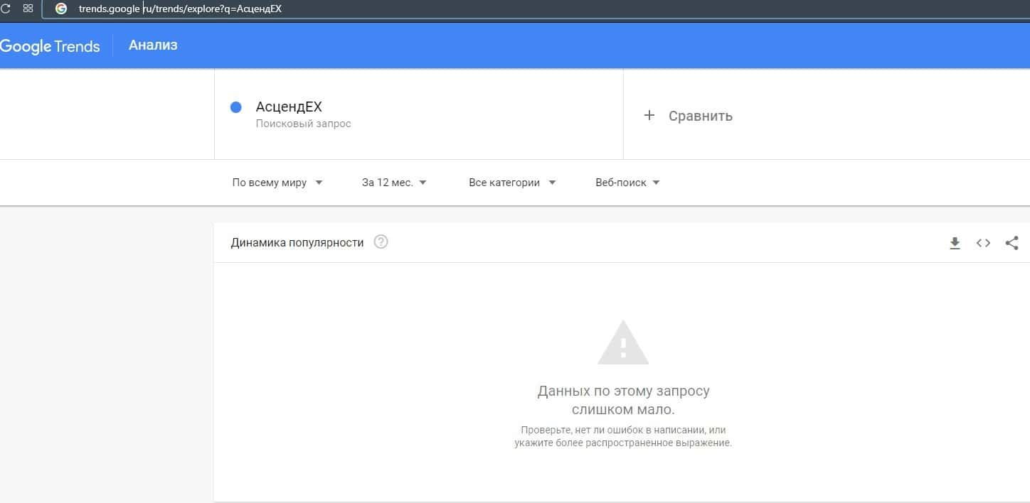 Ну и конечно же ситуация с изменением запроса на их официальный сайт "ascendex.com", также не порешало количество показов по версии Гугл Трендс.
