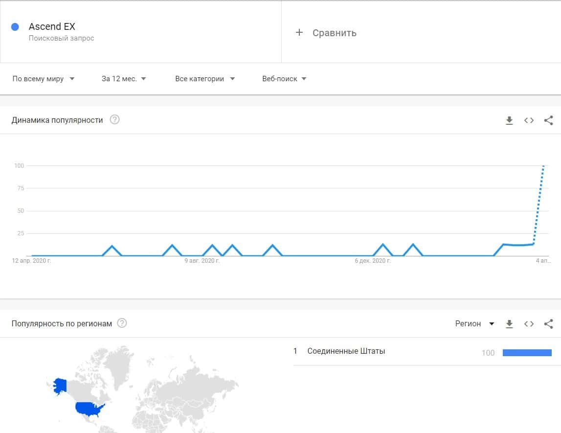 Что касается запросов по бренду "Ascend EX", то здесь в поисковой системе Гугл была замечена активность и в основном она исходила из Соединенных Штатов Америки.