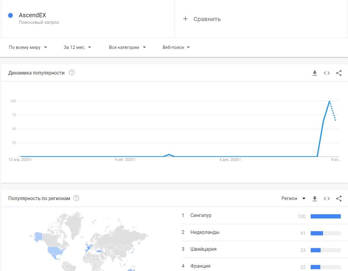 Мошенническая крипто-биржа "AscendEX" также ищется в поисковике Гугл и по запросам данного бренда и они исходят в основном из Сингапура, Нидерландов, Франции.