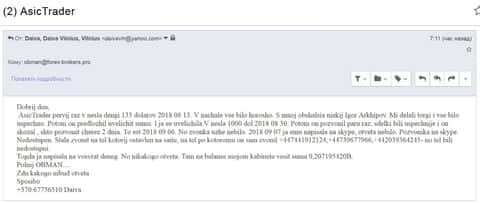 Поводом для написания данного информационного материала о брокерской кухне Асик Трейд стала жалоба пришедшая на почтовый адрес веб-площадки форекс-брокерс про. Одна из пострадавших клиентов forex-лохотрона AsicTrader пишет об утрате на сумму в размере около 250 долларов.