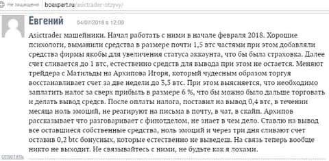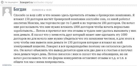 Один бывший клиент форекс-конторы Асик Трейдер, на сайте отзывов о подобных шарлатанах, описал историю как они его опрокинули. Менеджер-аналитик заманил клиента и вытащил 1000 долларов на счет и, когда дело дошло до создания заявки на вывод средств, то все пошло наперекосяк. Шулер понял, что денег со своей жертвы больше не вытянешь и перестал отвечать на его звонки.