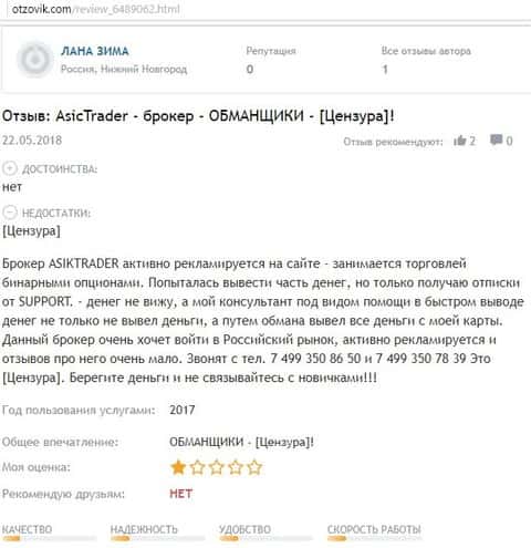 Одна женщина оставила отзыв о том как менеджер Александр, который представился трейдером-аналитиком конторы Асик Трейдер, забил ей баки и выпросил у жертвы все ее сбережения. Она и сама не поняла, как эта искусная форекс-гнида сделала это. Сколько она не просила вывести деньги у шулера Максима Кодера, который тоже там работал, на все была причина отказа. Жулик звонил с такого номера: +74993507839.