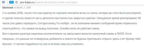 Человек очень расстроился, когда связался с мошеннической структурой Асик Трейдер. Группа аферистов, которая там работает закрутила мозги так, что они уговорили клиента вложить 927 долларов на счет открытый в данной кухне. Они пообещали, что будут помогать торговать на счете, подсказывая когда входить и закрывать сделки. При этом поначалу даже показывали профитную торговлю. Но когда человек отказался от перевода очередного транша в карман к аферистам, то сразу же жульбаны прекратили помогать в торговле, и на все вопросы по поводу запросов о выводе и процесса работы они не отвечают. Сколько человек раз не пробовал выводить хоть часть денег, на все приходили отказы. Ну естественно это очень распространенная ситуация на рынке Форекс и нечему тут удивляться. Деньги теперь не вернуть.