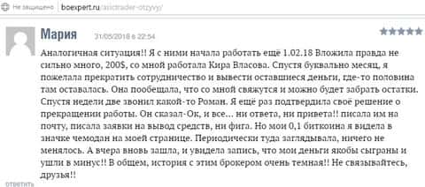 Еще одна жертва попалась на уловки к аферистам дилинговой кухни Асик Трейдер. Аналитик Кира Власова убедила женщину вложить 200 долларов и начать торговать. Со временем она захотела вывести часть денег, но ей отказали и сказали ждать. Позвонил Роман из этой же кухни и упрашивал остаться. Когда женщина окончательно сказала свое твердое нет, деньги со счета были слиты минусовой сделкой.