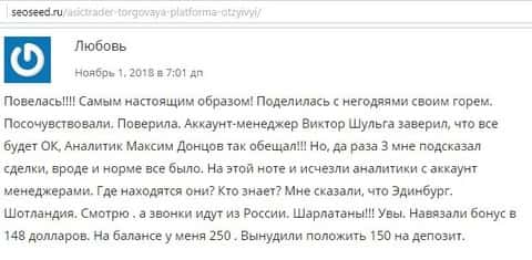 Женщина, которая написала данный отзыв просто в отчаянии. Шулер под псевдонимом Виктор Шульга, который был аккаунт-менеджером кухни Асик Трейдер, убедил и расположил доверие своей очередной жертвы. Аналитик Максим Донцов выудил у нее 150 долларов и разогнал немного счет. Но когда женщина стала упираться в повторном пополнении счета, то конторщики пропали без следа с ее деньгами.