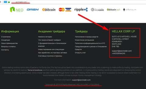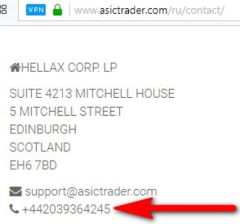 Согласно информации, которая размещена на официальном сайте кухни AsicTrader, контора принадлежит некой компании под названием HELLAX CORP LP, которая расположена по адресу: SUITE 4213 MITCHELL HOUSE 5 MITCHELL STREET EDINBURGH SCOTLAND EH6 7BD.
