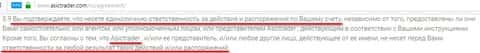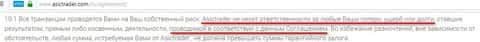 Следующий пункт торгового соглашения ДЦ Асик Трейдер тоже очень интересный и настораживает не связываться с ними. Контора не несет ответственности за любые убытки клиента, которые связаны с транзакциями по его счету, и в этом случае он не должен предъявлять никаких претензий компании.
