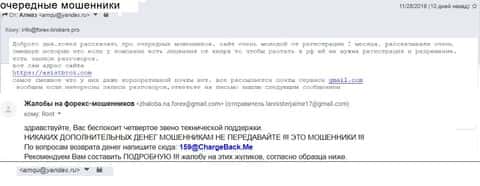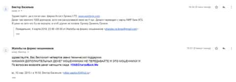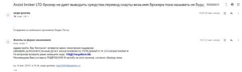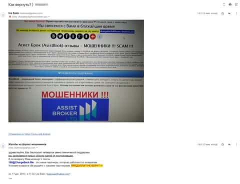 Письмо пришло с вопросом и скриншотом нашей статьи, так как человека обманули и кинули на деньги жулики из форекс-кухни АsistBrok. Мошенники заманили человека своими уговорами и ждали когда он скинет им денег на счет. Когда средства поступили они сделали так, что их невозможно было вывести и просили вкинуть еще денег для оплаты комиссии. Но клиент отказался это делать и больше шарлатаны Асист Брок на связь не выходили.
