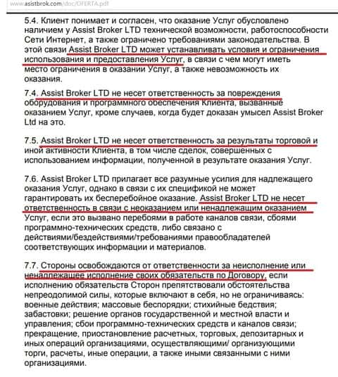 Далее рекомендую ознакомится с наиболее примечательными фрагментами текста из жульнического договора конторы Асист Брок. Так как здесь представлены одни подставы для клиентов сей кухонной форекс-организации. Мошенники AsistBrok ни за что не отвечают, при этом каждый клиент берет на себя все риски.