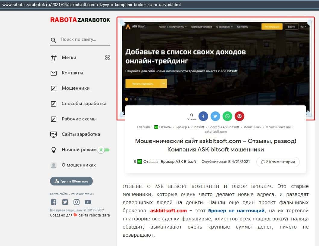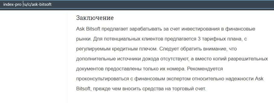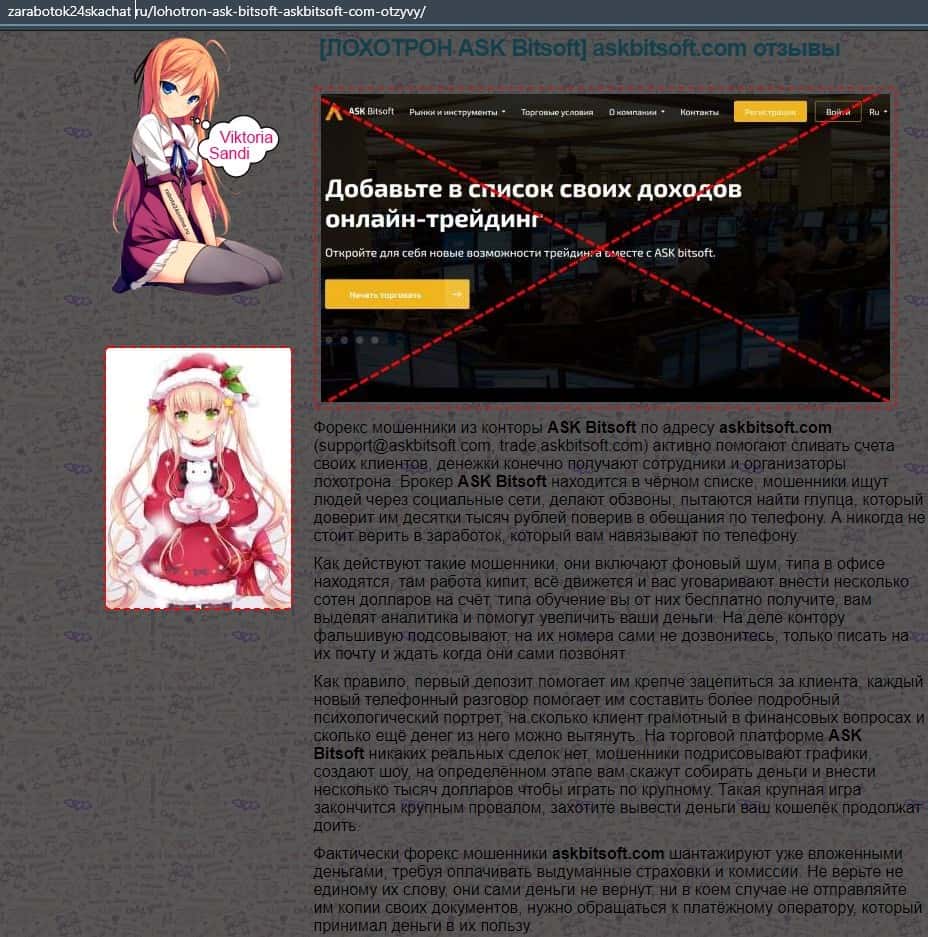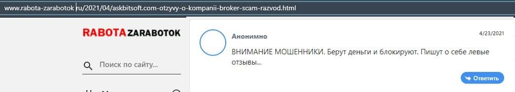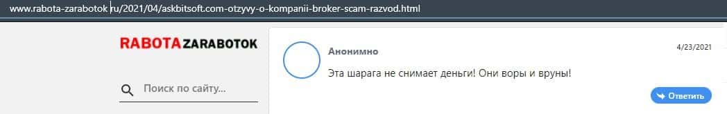 Еще один ресурс высказался с недоверием к мошеннической организации ASKBitSoft. Автор статьи считает, что этот брокер нелегален, поэтому очень опасно вкладывать туда свои деньги.
