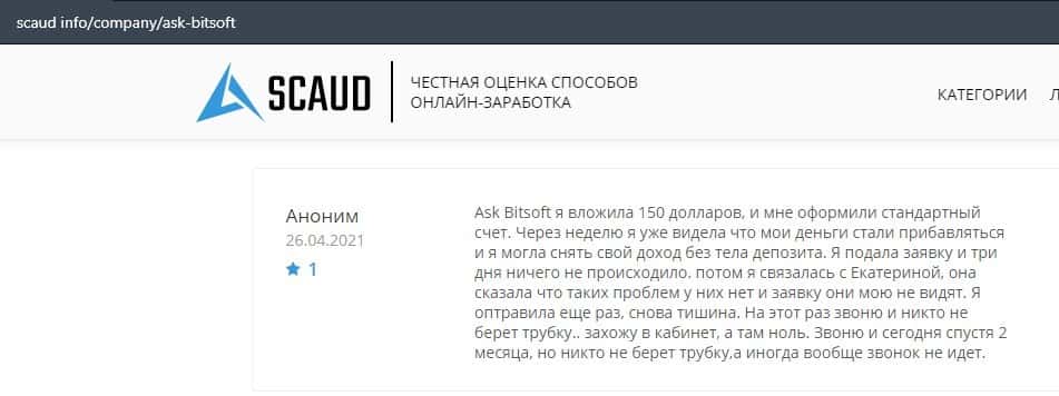 Далее вы можете прочесть подробный отзыв от человека, который попался на удочку в лохотрон ASKBitSoft. Он вложил 150 долларов и деньги каким-то образом пропали со счета.