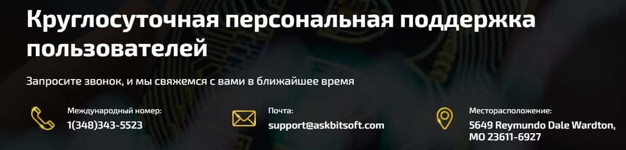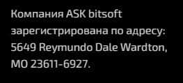 Далее представлены контактные данные мошеннической организации ASKBitSoft, где определенно указан номер телефона, электронная почта и адрес регистрации шараги: