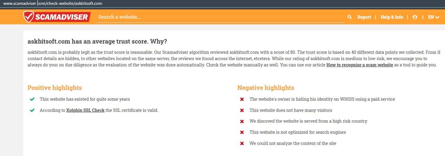 Сервис scamadviser com не определил никакой информации касательно безопасности портала мошенников ASKBitSoft, но в тоже время нашел множество ошибок на их ресурсе.